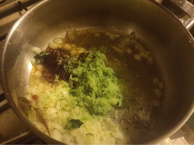 Coloque o preparado na meloa e rale novamente a courgette e adicone a cebola frita e as sementes de sésamo para compor o arranjo.